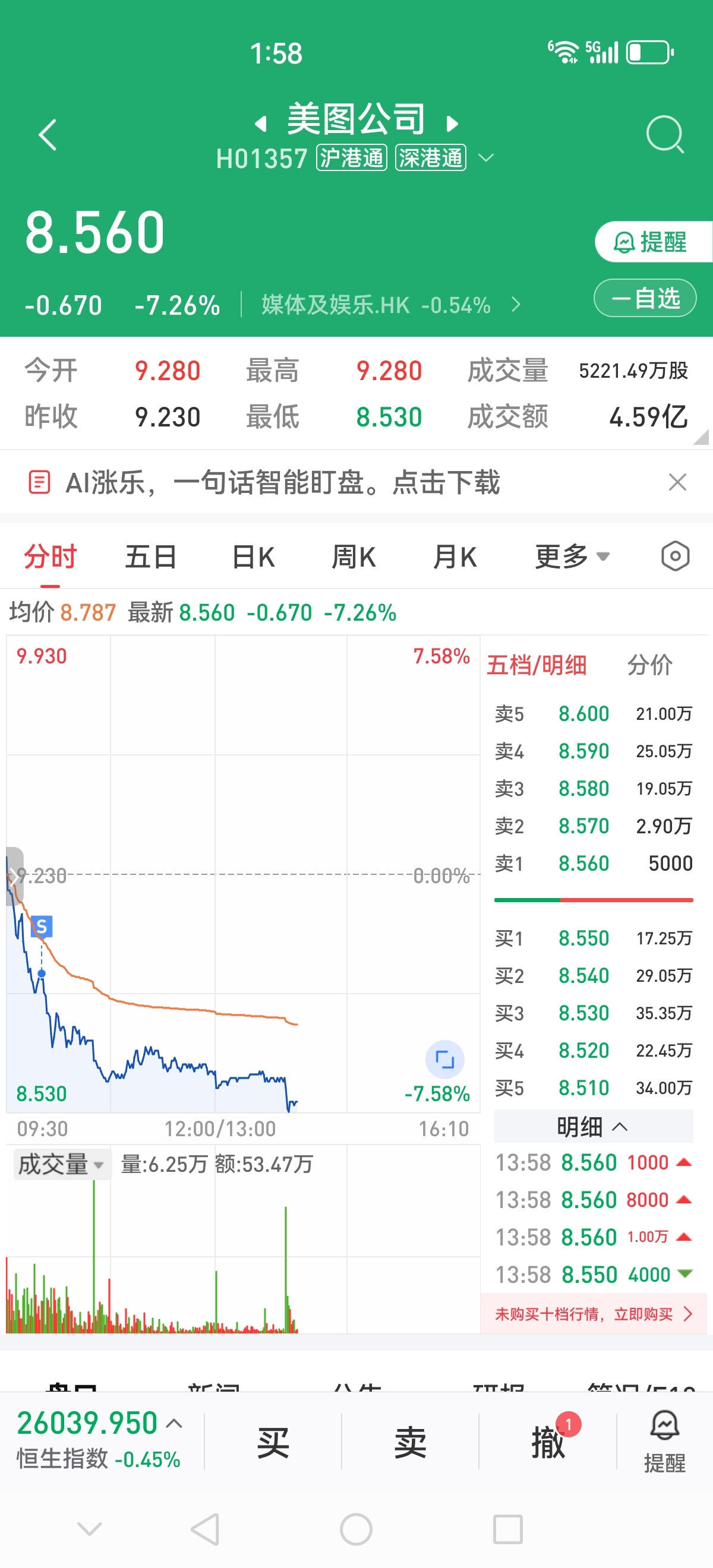 $美图公司(HK|01357)$ 昨天两个点追的,今天-3割的,还好下手快,要不又要止损割肉了,美图已经完全走坏了