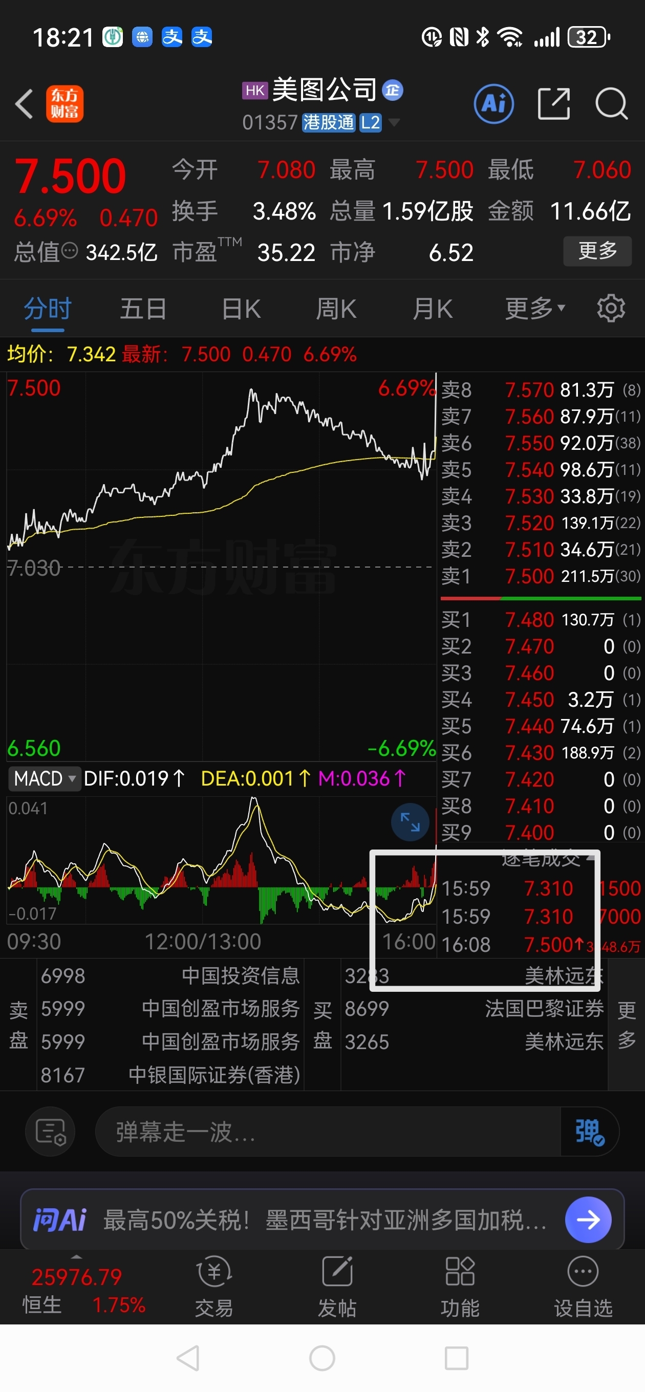 $美图公司(HK|01357)$ 今天久不见的大阳线,尾盘8min涨了0.19元,这涨幅近3个点了吧。厉害呀!