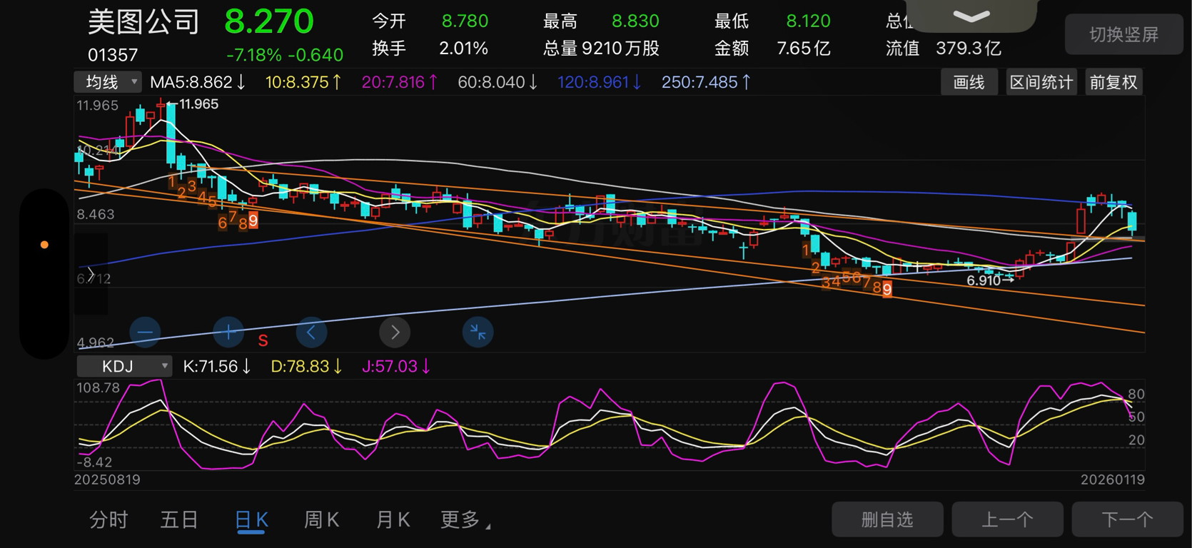 $美图公司(HK|01357)$ 今天的下跌其实是必然,刚突破下降趋势的一个回踩上轨动作而已,顺便试探60天线和缺口支撑。所以没什么大惊小怪的,在这里磨两天主力又会拉起,这是一个很好的上车机会。