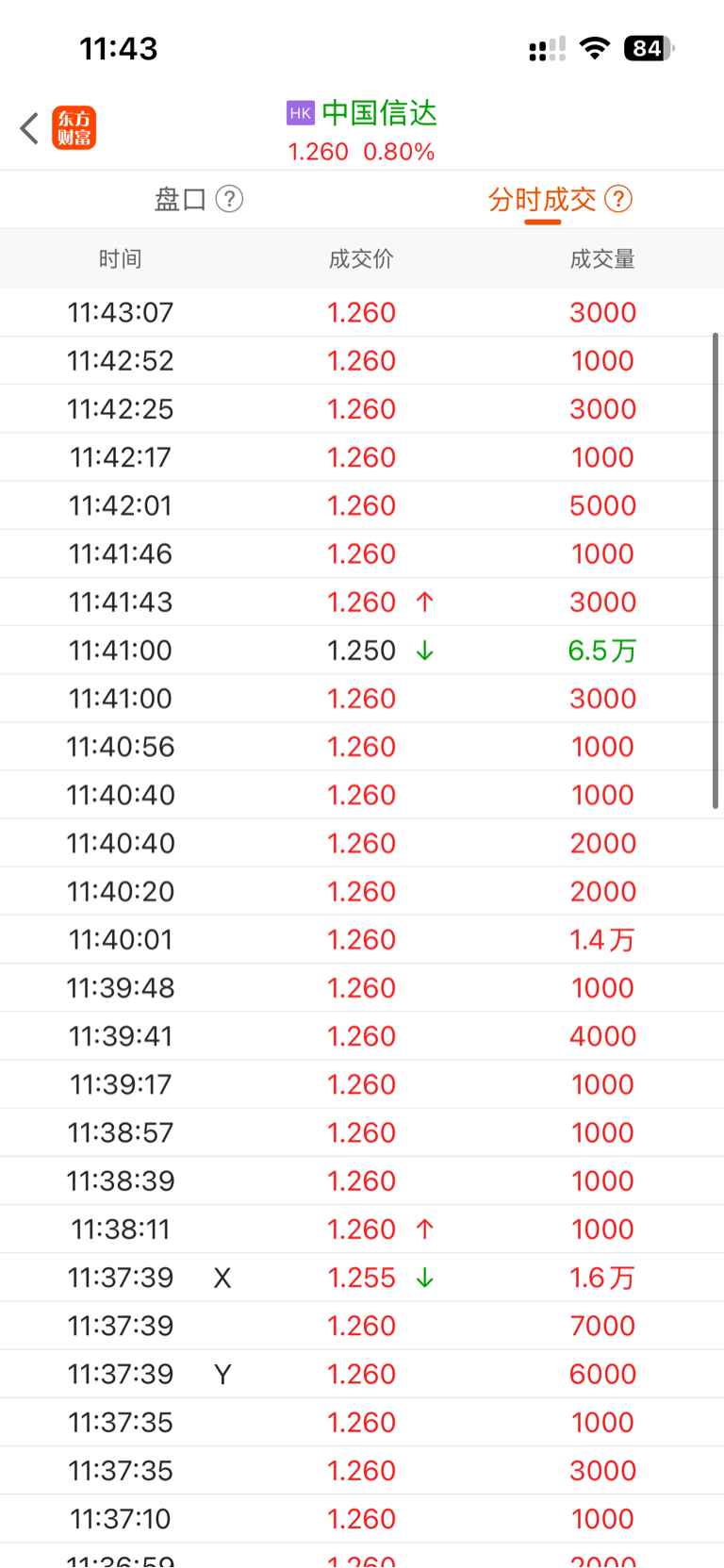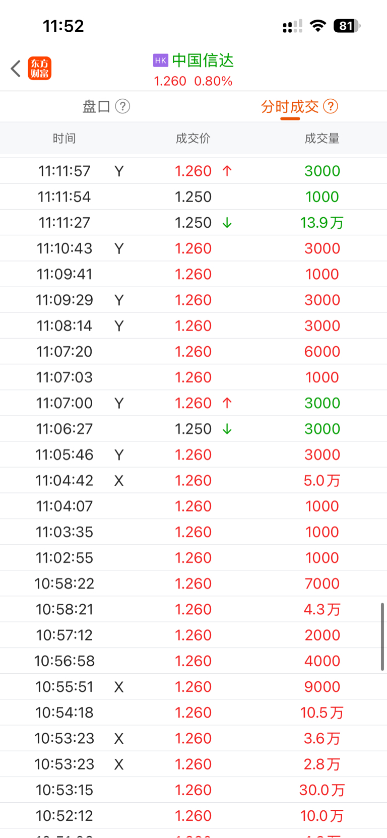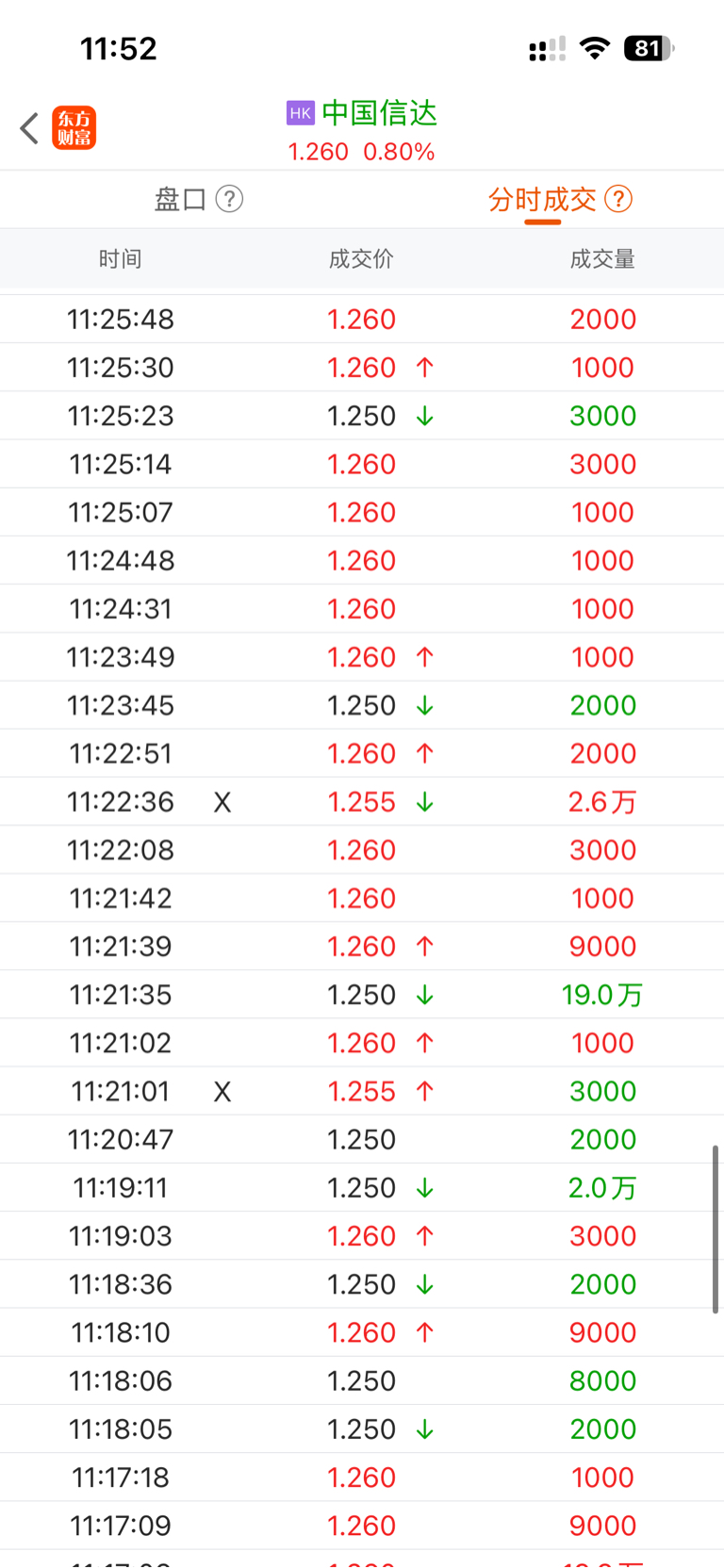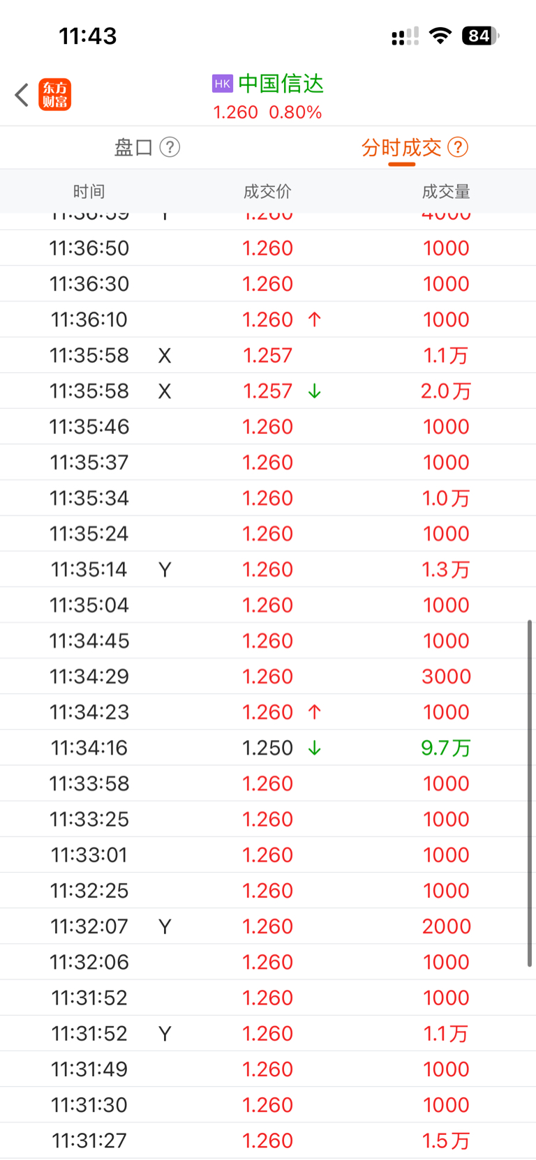 $中国信达(HK|01359)$ 1个小时全是主动买入1.26的,然后下午一个大单砸一下125,100万砸一下就会有人跟砸破很搞笑 想想股票谁格局谁傻 昨天1.29卖 我就是傻1.26就接回来了。今天严重缩量,但凡砸一下就完蛋