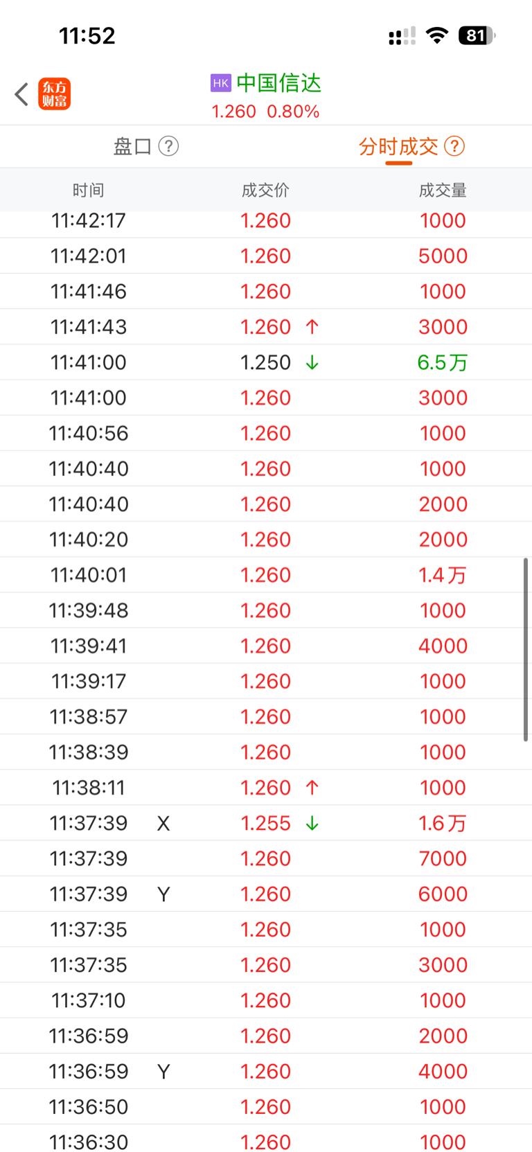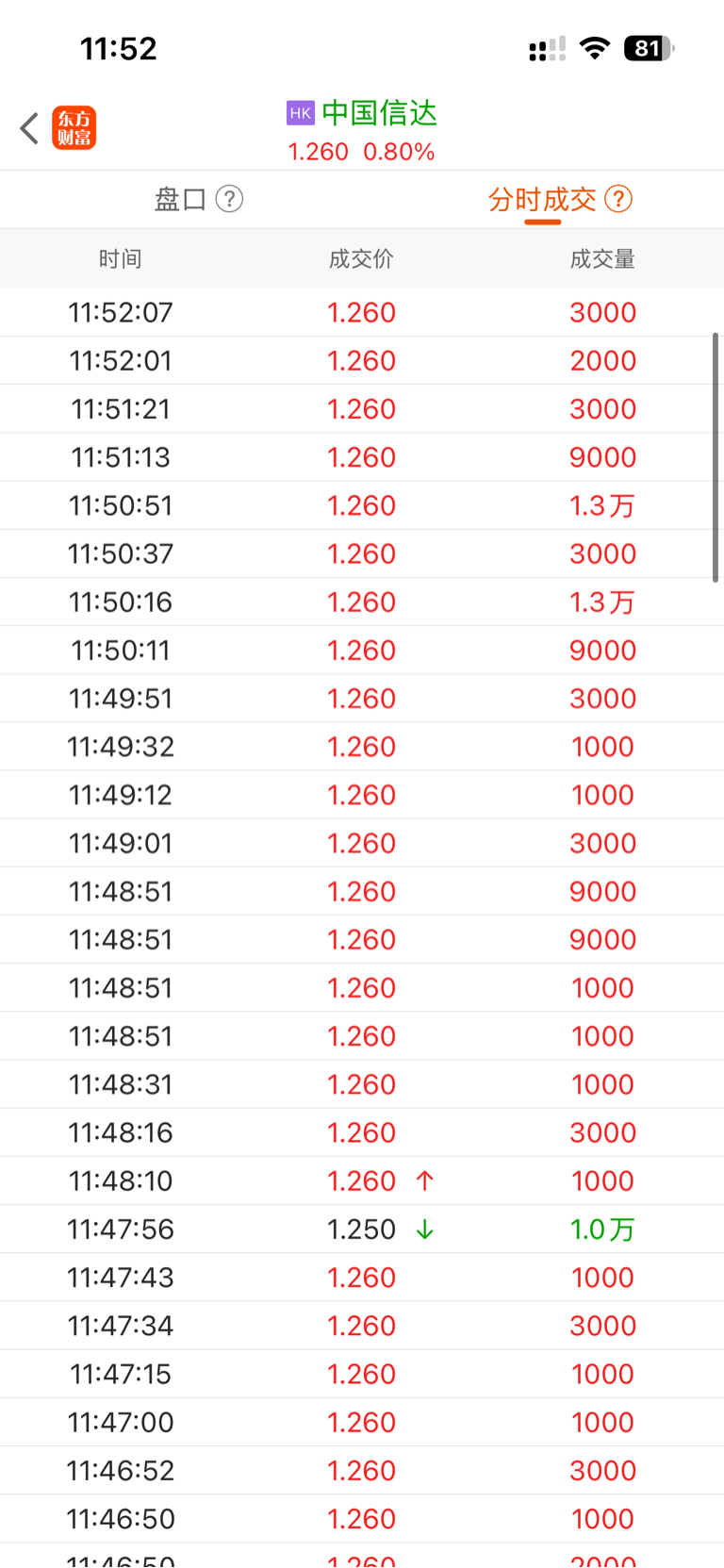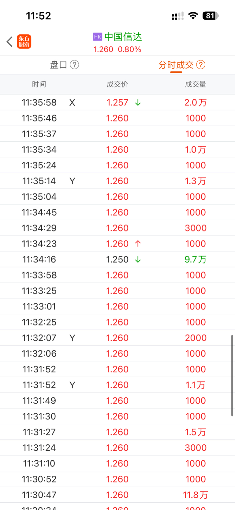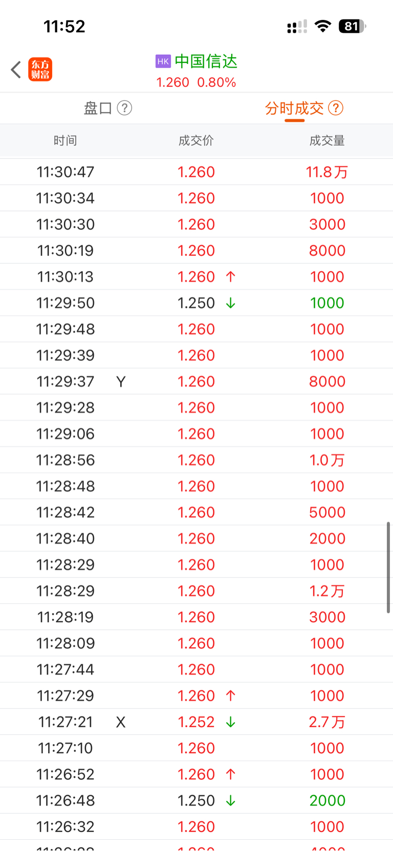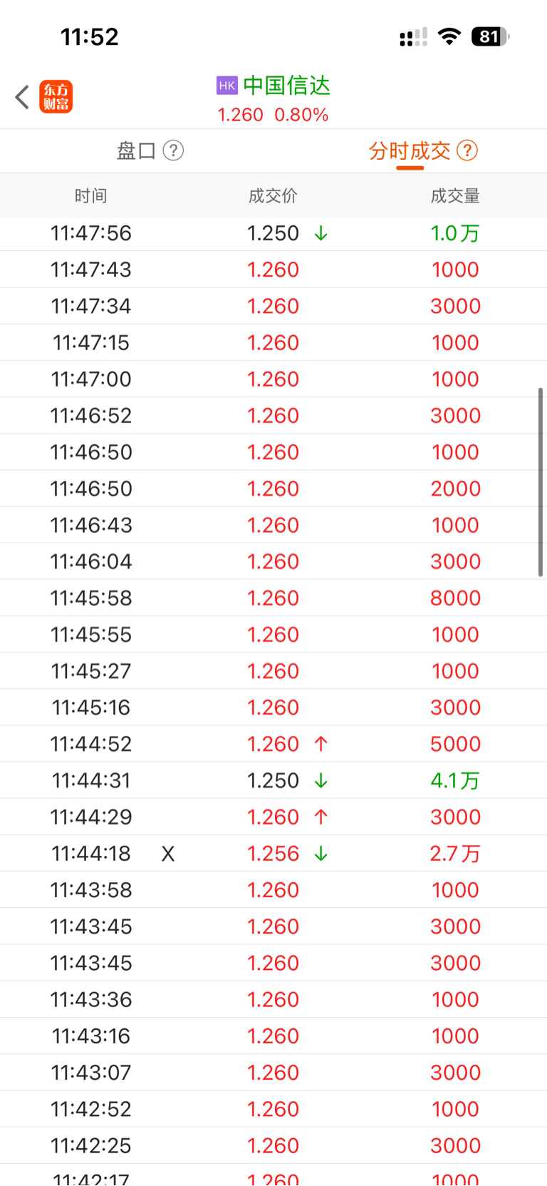 $中国信达(HK|01359)$ 1个小时全是主动买入1.26的,然后下午一个大单砸一下125,100万砸一下就会有人跟砸破很搞笑 想想股票谁格局谁傻 昨天1.29卖 我就是傻1.26就接回来了。今天严重缩量,但凡砸一下就完蛋