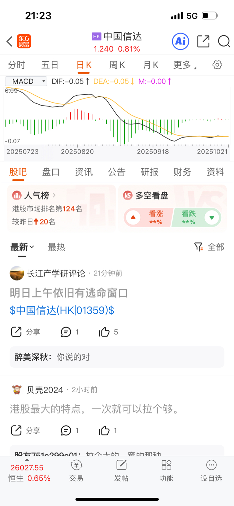 $中国信达(HK|01359)$ 1.2多已加仓10万股、后面再加仓就两个点位了、1.1多,和0.9多。越到这个位置越不用怕了。性价比还是比较高的。也不用听一些人危言耸听。