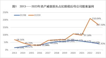 从金融行业来看,选择对比了工商银行和中国信达公司。就资产减值损失占比除税后母公司股东溢利来说,从2013年至2023年,随着工商银行和中国信达公司发展,两公司每年都有计提了的资产减值损失,累计分别是14771.3亿元和980.92亿元,累计计提除税后母公司股东溢利分别为33789亿元和1311.21亿元,资产减值损失占比除税后母公司股东溢利分别为43.72%和74.81%;由图1 可知,工商银行的资产减值损失占比除税后母公司股东溢利呈现逐年升高后缓慢下降的趋势,但中国信达的呈现先抑后扬逐年快速上升的态势,最高高达210%。