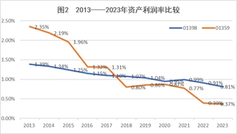 就两公司资产利润率来说,随着工商银行和中国信达公司发展,两公司资产利润率都出现了逐年下降的态势。由图2 可知,从2013年至2023年,工商银行资产利润率则是较为平缓,但是中国信达的下降较为快速,反映了两公司内部治理能力与治理水平存在显著的差异。也就是说,中国信达对标工商银行还有较大的内部治理能力与治理水平的提升空间。