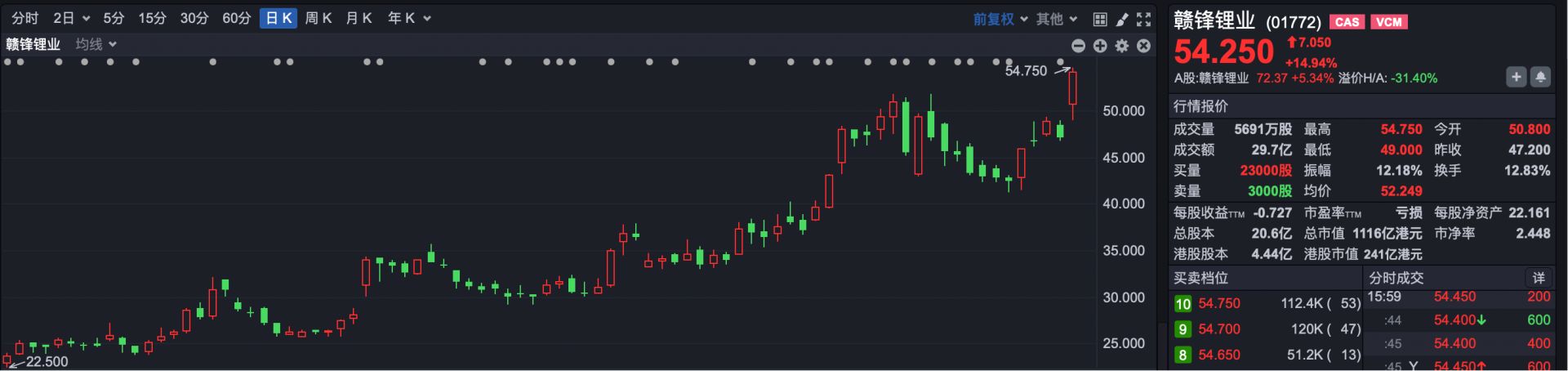 板块方面,仍是有色金属板块走势最强。其中,赣锋锂业(01772.HK)涨近15%,中广核矿业(01164.HK)涨超13%,中国铝业(02600.HK)涨超10%,天齐锂业(09696.HK)涨超9%,中国宏桥(01378.HK)、紫金黄金国际(02259.HK)涨超8%。