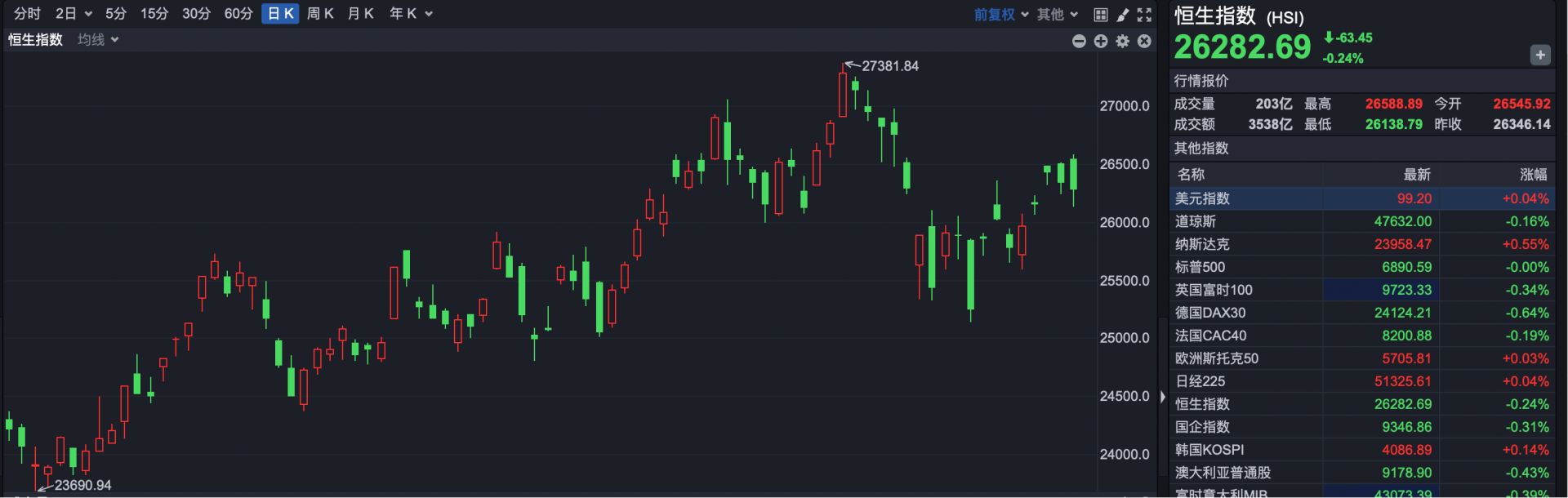 截至收盘,恒指报收于26282.69点,下跌63.45点,跌幅0.24%。