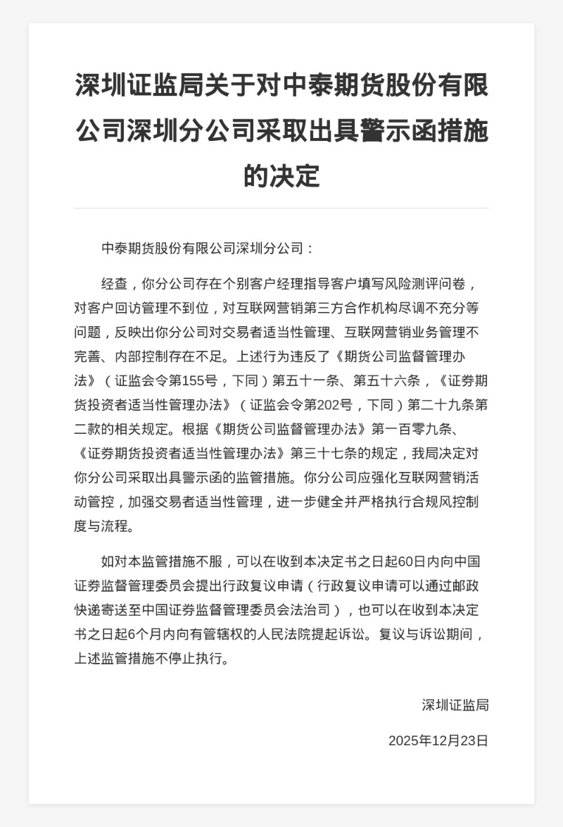 中泰期货深圳分公司被出具警示函,涉适当性管理及互联网营销等问题