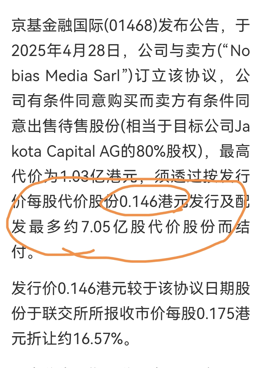 $京基金融国际(HK|01468)$ 按说公告协议之后的股价应该是利于对方的!这么久都不成,会不会京基后悔这个股价而一直延后,,,股价就这样走大概率工资都发不下去,,,哈哈