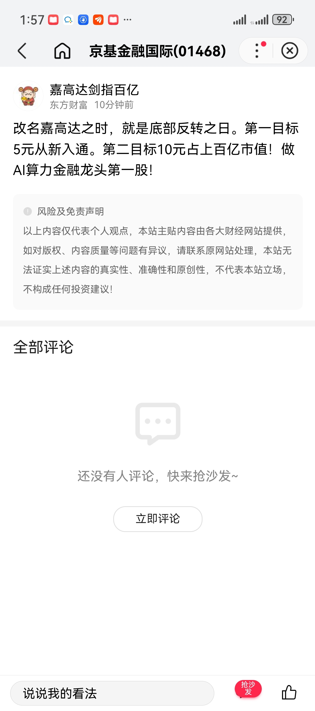 温馨提示: 1.根据《证券法》规定,禁止编造、传播虚假信息或者误导性信息,扰乱证券市场;2.用户在本社区发表的所有资料、言论等仅代表个人观点,与本网站立场无关,不对您构成任何投资建议。用户应基于自己的独立判断,自行决定证券投资并承担相应风险。《东方财富社区管理规定》