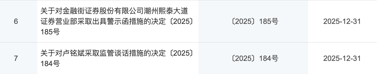 另一则处罚决定显示,广东监管局对员工卢铭斌采取监管谈话的行政监管措施。