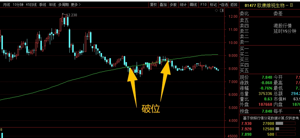 $欧康维视生物-B(HK|01477)$ 中期走势偏弱了,主要是前面高位回落下来,跌破了大均线的支撑,没有能马上拉回去站稳,形成了破位趋势,这时候就要大幅减仓应对了,不然连续回落下来,就比较被动。目前来看整体趋势还是向下,暂时不考虑,同时也不要加仓。等站稳了安全线后再考虑。#炒股日记# #收盘点评#