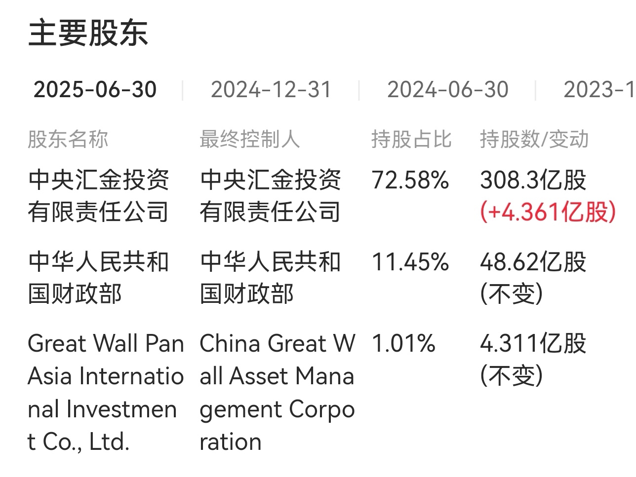 $中国再保险(HK|01508)$ 花旗的股份在去年上半年大部分减持了,增持的是中央汇金.外资本来是想打压的,结果没有任何反应,今非昔比了