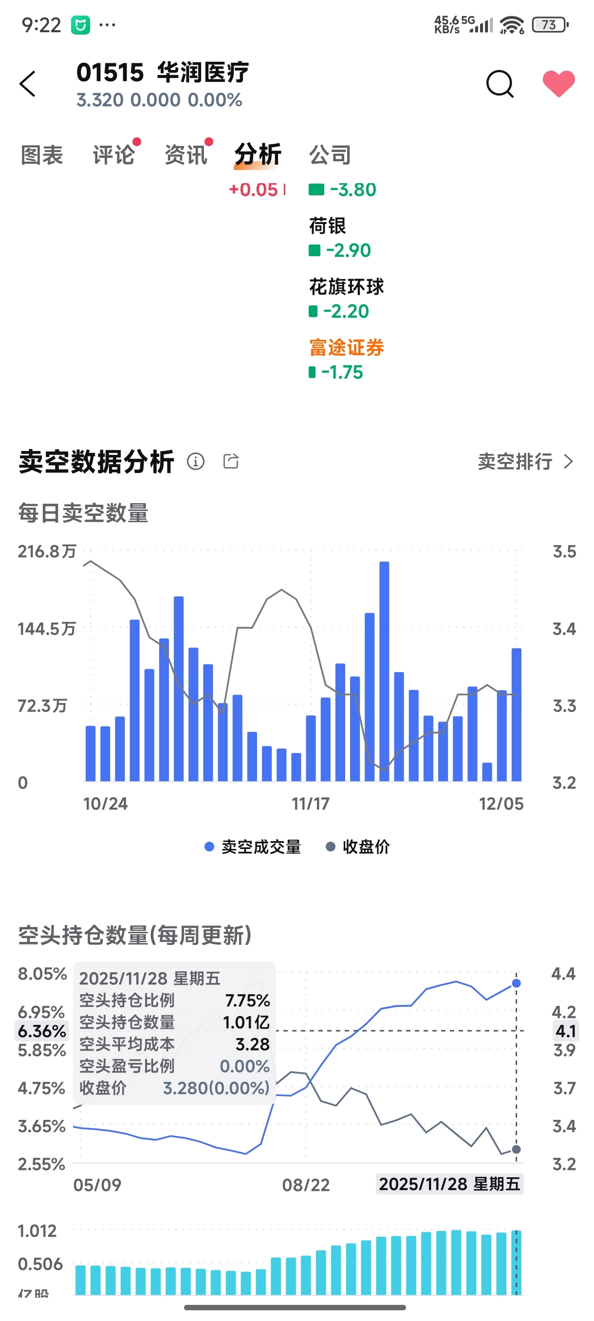 $华润医疗(HK|01515)$ 截止上周五收盘卖空量还在增加,按照华润医疗的日成交量这批做空资本在目前日活跃度下短期根本出不来,盘子很轻了,韭菜们这是我们千载难逢的逼空赚大钱的机会,本人锁仓39万股,并可以继续追加买入,呼吁志同道合的韭菜一起来打翻身仗