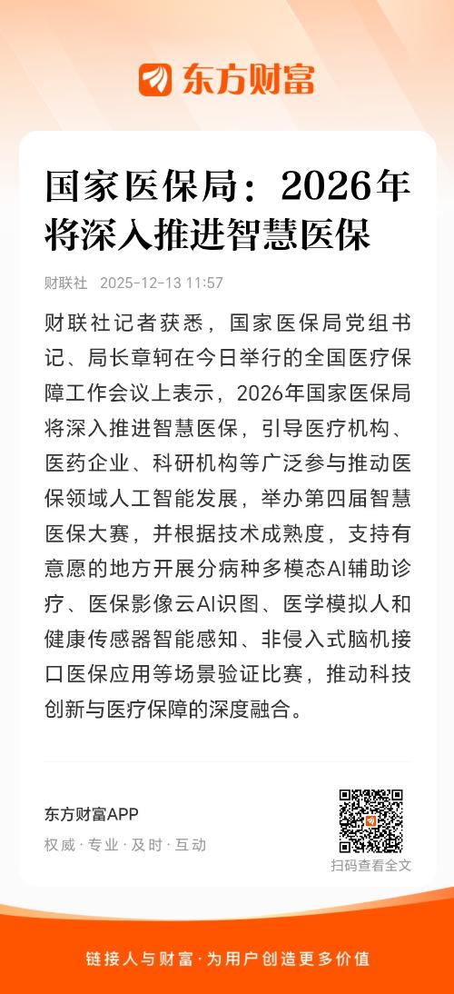 财联社记者获悉,国家医保局党组书记、局长章轲在今日举行的全国医疗保障工作会议上表示,2026年国家医保局将深入推进智慧医保,引导医疗机构、医药企业、科研机构等广泛参与推动医保领域人工智能发展,举办第四届智慧医保大赛,并根据技术成熟度,支持有意愿的地方开展分病种多模态AI辅助诊疗、医保影像云AI识图、医学模拟人和健康传感器智能感知、非侵入式脑机接口医保应用等场景验证比赛,推动科技创新与医疗保障的深度融合。