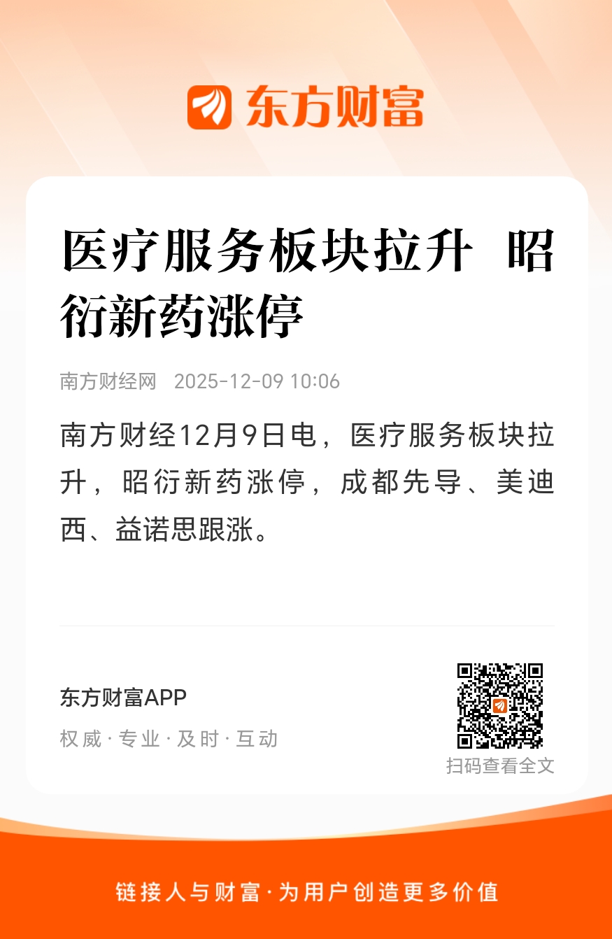 南方财经12月9日电,医疗服务板块拉升,昭衍新药涨停,成都先导、美迪西、益诺思跟涨。