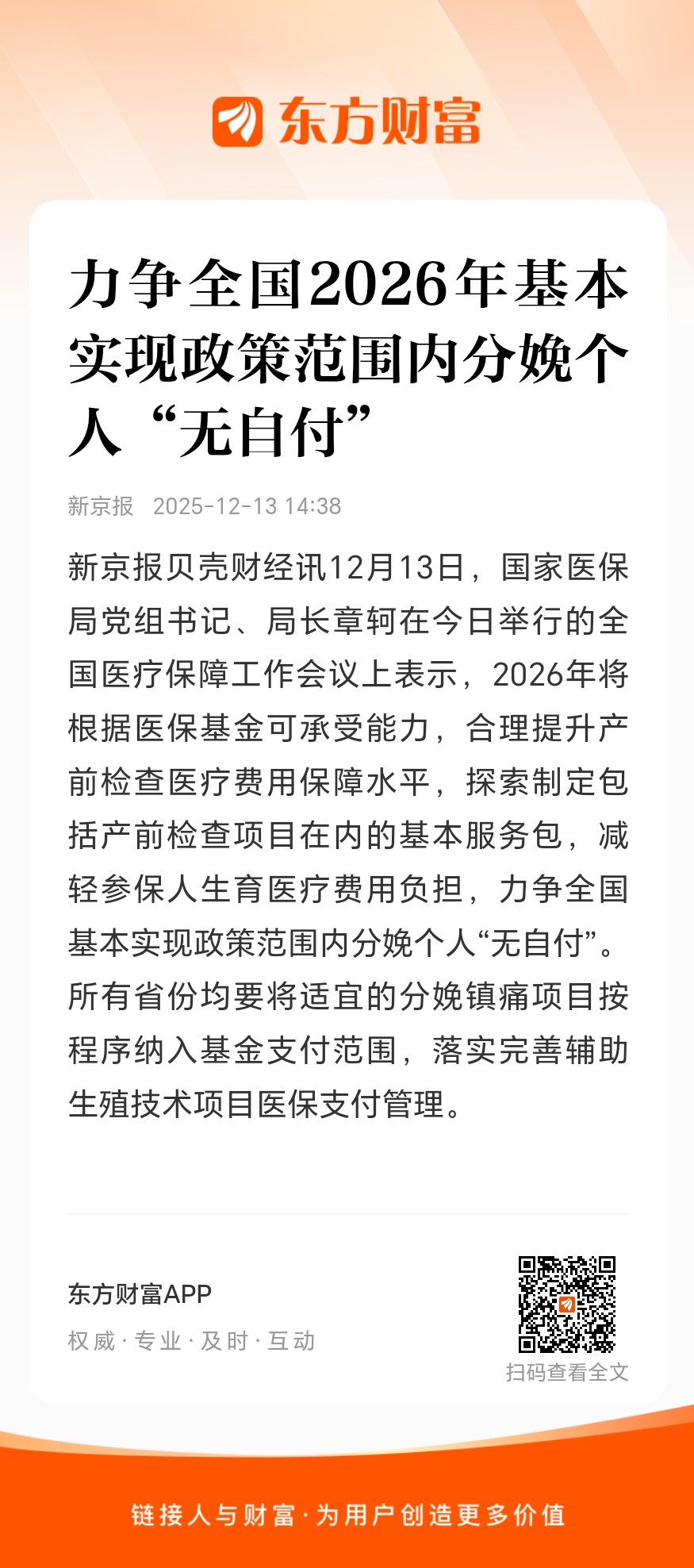 新京报贝壳财经讯12月13日,国家医保局党组书记、局长章轲在今日举行的全国医疗保障工作会议上表示,2026年将根据医保基金可承受能力,合理提升产前检查医疗费用保障水平,探索制定包括产前检查项目在内的基本服务包,减轻参保人生育医疗费用负担,力争全国基本实现政策范围内分娩个人“无自付”。所有省份均要将适宜的分娩镇痛项目按程序纳入基金支付范围,落实完善辅助生殖技术项目医保支付管理。