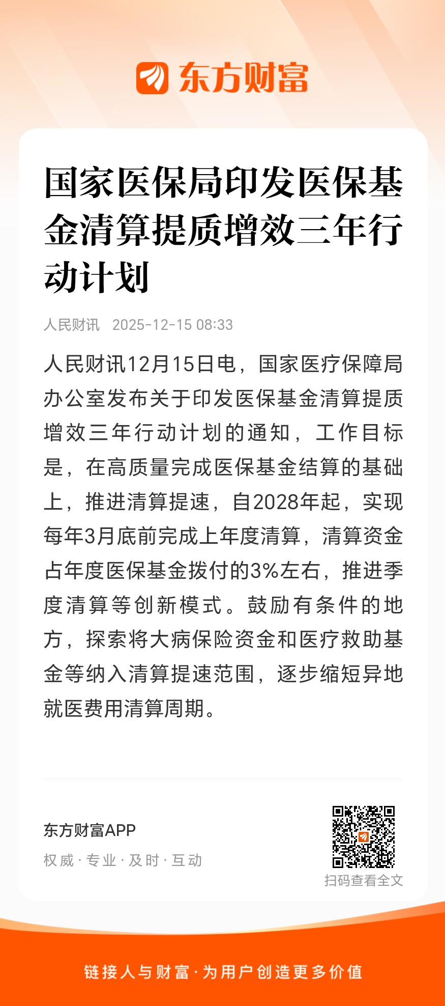 人民财讯12月15日电,国家医疗保障局办公室发布关于印发医保基金清算提质增效三年行动计划的通知,工作目标是,在高质量完成医保基金结算的基础上,推进清算提速,自2028年起,实现每年3月底前完成上年度清算,清算资金占年度医保基金拨付的3%左右,推进季度清算等创新模式。鼓励有条件的地方,探索将大病保险资金和医疗救助基金等纳入清算提速范围,逐步缩短异地就医费用清算周期。