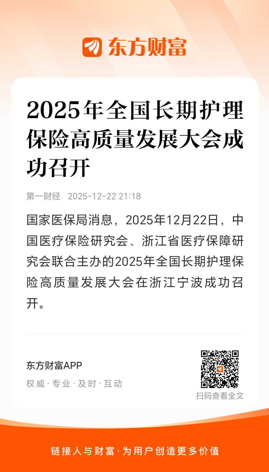 国家医保局消息,2025年12月22日,中国医疗保险研究会、浙江省医疗保障研究会联合主办的2025年全国长期护理保险高质量发展大会在浙江宁波成功召开。本次大会旨在搭建长期护理保险实践探索与经验交流的平台,推广制度创新成果与产业高质量发展成效,推动长期护理产业朝着规模化、标准化、专业化、数字化的方向稳步迈进。
