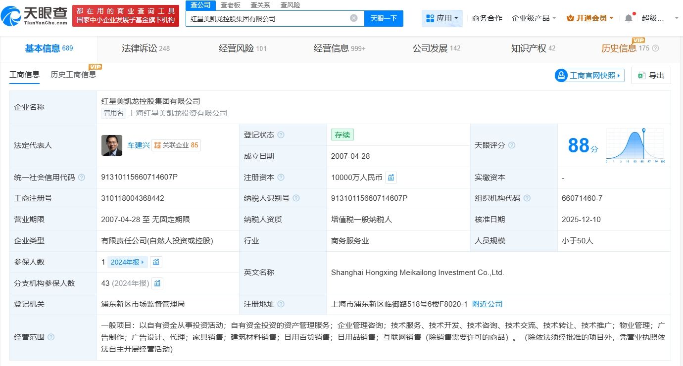 南方财经12月19日电,天眼查App显示,近日,红星美凯龙控股集团有限公司发生工商变更,新增上海美凯壹号企业管理合伙企业(有限合伙)、和谐健康保险股份有限公司、浙江瑞运投资有限公司为股东,同时注册资本由2亿人民币减至1亿人民币。红星美凯龙控股集团有限公司成立于2007年4月,法定代表人为车建兴,经营范围包括以自有资金从事投资活动、自有资金投资的资产管理服务、企业管理咨询等。股东信息显示,该公司现由车建兴、车建芳及上述新增股东共同持股。