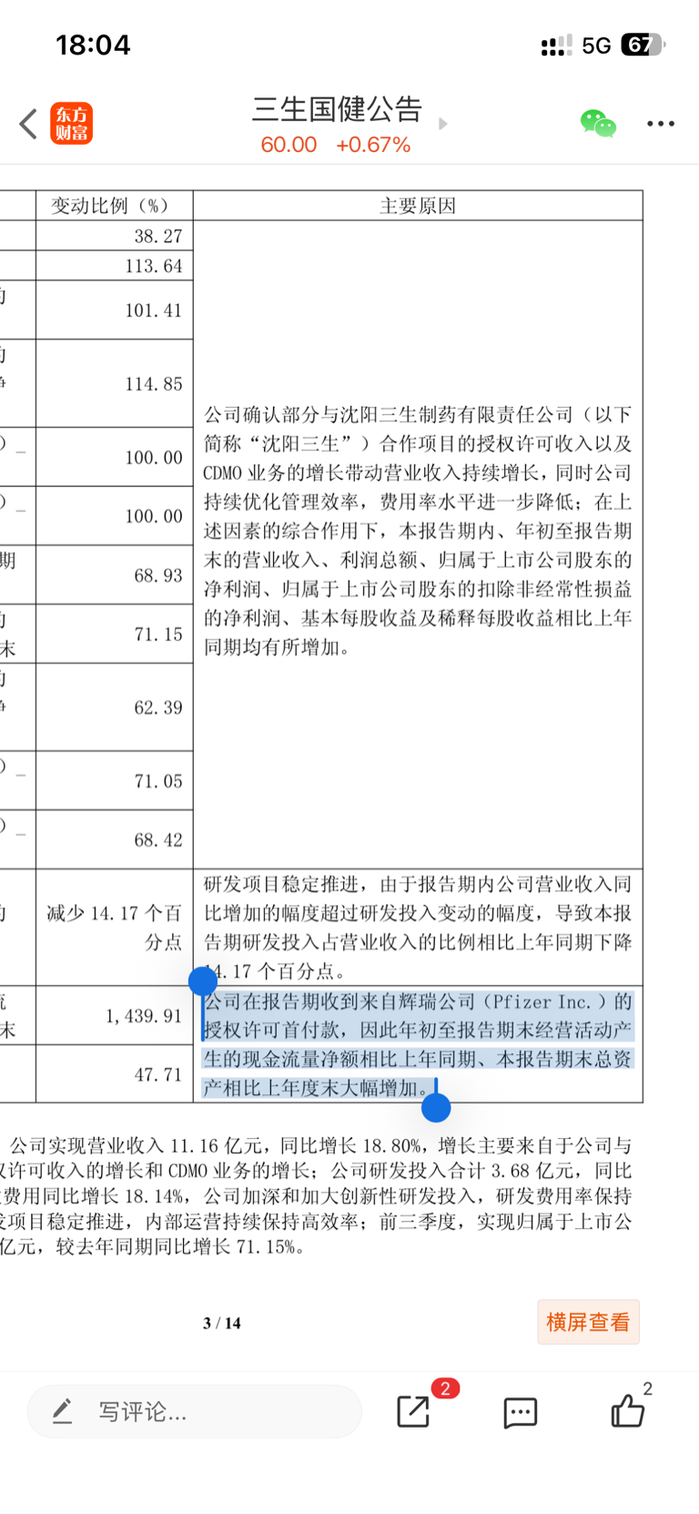 $三生制药(HK|01530)$ 公司在报告期收到来自辉瑞公司 (Pfizer Inc.) 的授权许可首付款,因此年初至报告期末经营活动产生的现金流量净额相比上年同期、本报告期末总资产相比上年度末大幅增加。
