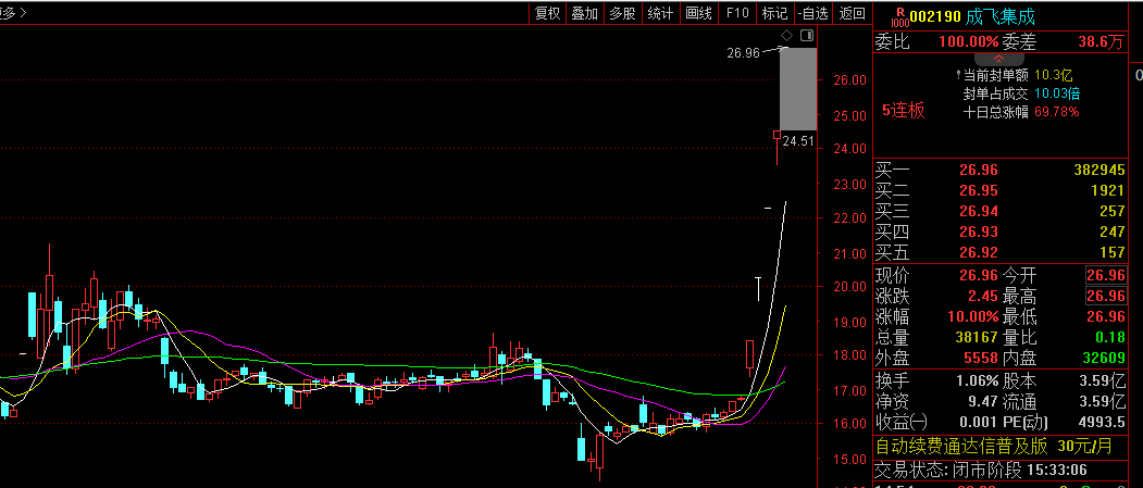 成飞集成:5连板,市场最高板,军工龙头。虽然大单一字,但军工仍旧出现了较大分歧,今天还是一字预期,如果军工分歧加大的话,成飞集成才可能开板,能否回封会直接影响到军工的炒作持续性。