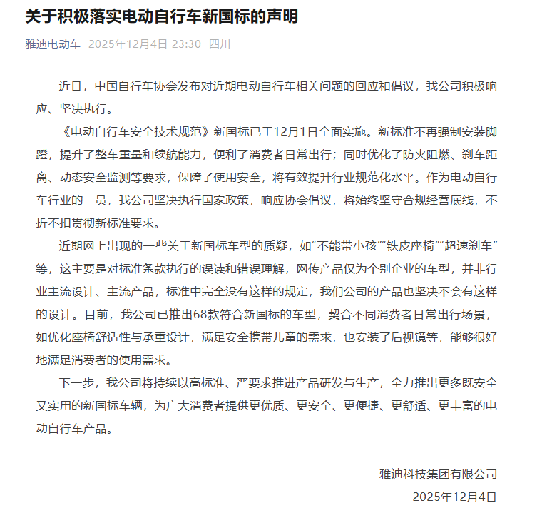 12月4日,雅迪科技集团有限公司发布声明: