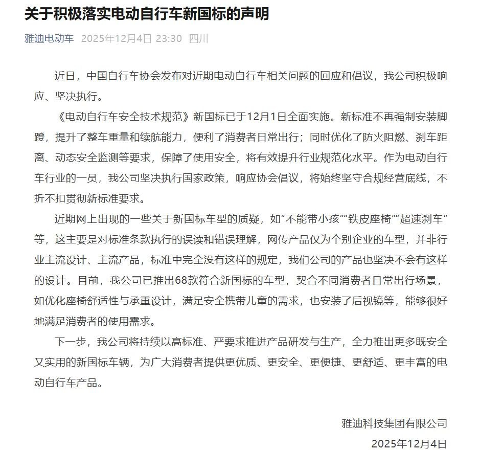 爱玛科技集团始终将用户安全与产品合规置于首位。我们全面拥护2025年电动自行车新国标的实施,并已提前完成全系产品的技术升级与生产切换。作为电动自行车行业的一员,我公司坚决执行国家政策,响应协会倡议,将始终坚守合规经营底线,不折不扣贯彻新标准要求。