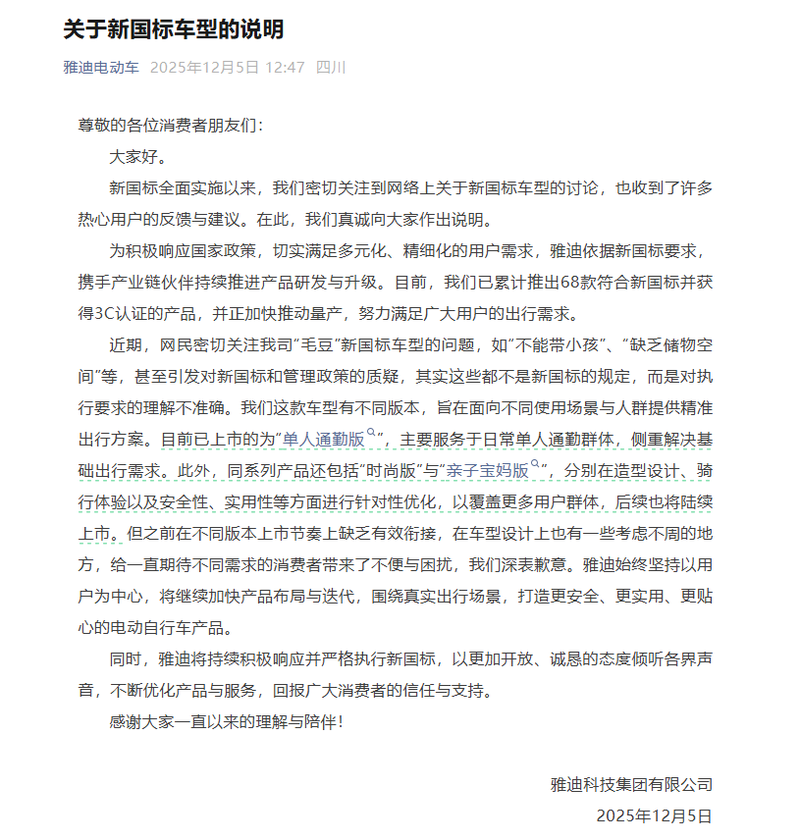 12月5日,雅迪、爱玛、绿源、台铃、小刀、九号、小牛、新日纷纷发布声明称,“网传产品仅为个别企业的车型,并非行业主流设计、主流产品。”其中,针对外界广泛关注的“毛豆”新国标车型“不能带小孩”“缺乏储物空间”等问题,雅迪12月5日下午致歉,“不同版本上市节奏上缺乏有效衔接,在车型设计上也有一些考虑不周的地方,给一直期待不同需求的消费者带来了不便与困扰,我们深表歉意。”