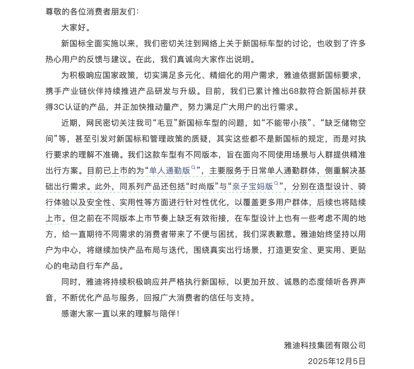 近日,雅迪电动车于官微平台发布关于新国标车型说明致歉,回应此前“雅迪电动车不能带小孩”等争议,称将不断优化产品与服务。