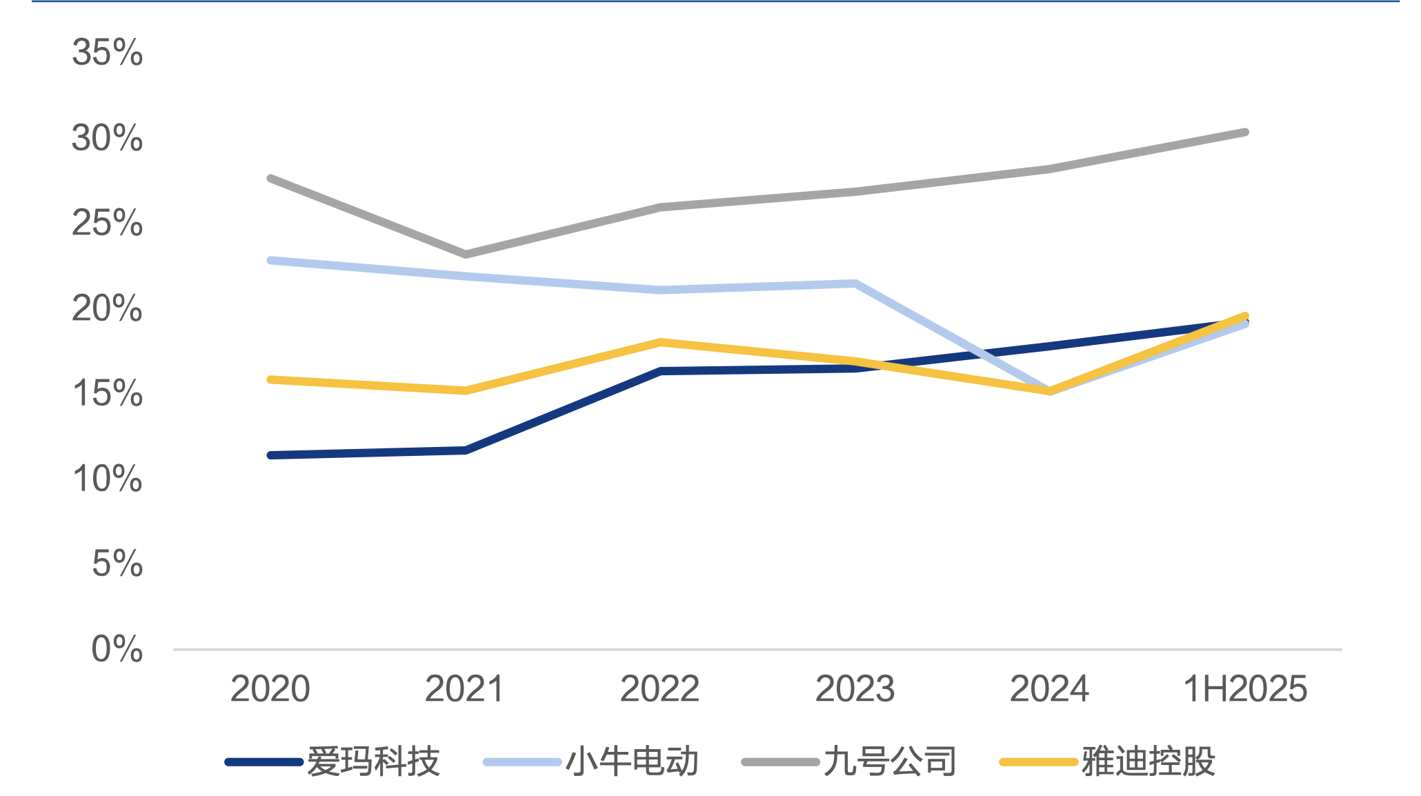 毛利率方面,2025年上半年,雅迪控股毛利率为19.6%,与2024年同期的18%相比有所增长。不过对比同行业看,雅迪控股毛利率并不算高,其中九号公司的毛利率2025年上半年达到30.4%,远高于雅迪控股。