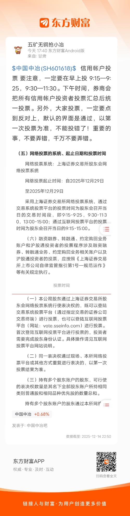 $中国中冶(SH601618)$ 信用帐户投票 要注意,一定要在早上投 9:15—9:25,9:30—11:30。下午时间,券商会把所有信用帐户投资者投票汇总后统一投票。另外,大家投票,一定要点到反对上,默认的界面是通过,以第一次投票为准,不能投错了!重要的事,不要弄错,千万不要弄错。