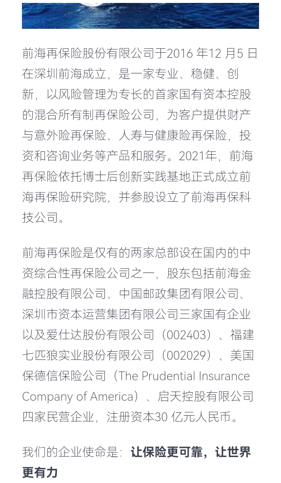 前海再保险股份有限公司于2016 年12 月5 日在深圳前海成立,是一家专业、稳健、创新,以风险管理为专长的首家国有资本控股的混合所有制再保险公司,为客户提供财产与意外险再保险、人寿与健康险再保险,投资和咨询业务等产品和服务。2021年,前海再保险依托博士后创新实践基地正式成立前海再保险研究院,并参股设立了前海再保科技公司。
