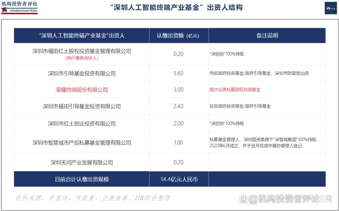 经查询,“深圳人工智能终端产业基金”的主要出资人包括:深圳市引导基金(认缴出资5.6亿元)、“荣耀终端”(认缴出资3亿元)、福田引导基金(认缴出资2.4亿元)、“红土创业”(“深创投”系,认缴出资2亿元)、“深智城集团”(全称“深圳市智慧城市科技发展集团有限公司”,2018年12月注册成立)旗下私募基金管理人“深智城产投”(全称“深圳市智慧城市产投私募基金管理有限公司”)等;基金执行事务合伙人则为“深创投”旗下私募基金管理人“深创投红土私募股权投资基金管理(深圳)有限公司”。