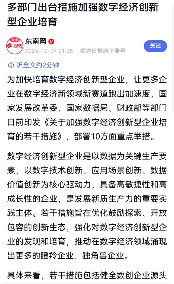 为加快培育数字经济创新型企业,让更多企业在数字经济新领域新赛道跑出加速度,国家发展改革委、国家数据局、财政部等部门日前印发《关于加强数字经济创新型企业培育的若干措施》,部署10方面重点举措。