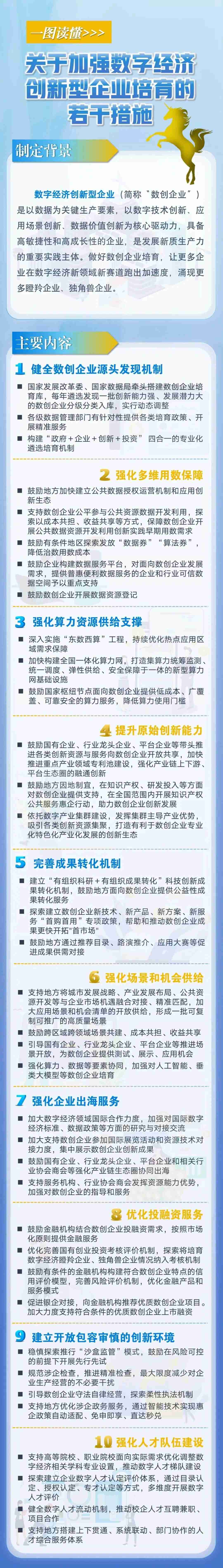 具体来看,若干措施包括健全数创企业源头发现机制、强化多维用数保障、强化算力资源供给支撑、提升原始创新能力、完善成果转化机制、强化场景和机会供给、强化企业出海服务、优化投融资服务、建立开放包容审慎的创新环境、强化人才队伍建设等10个方面。