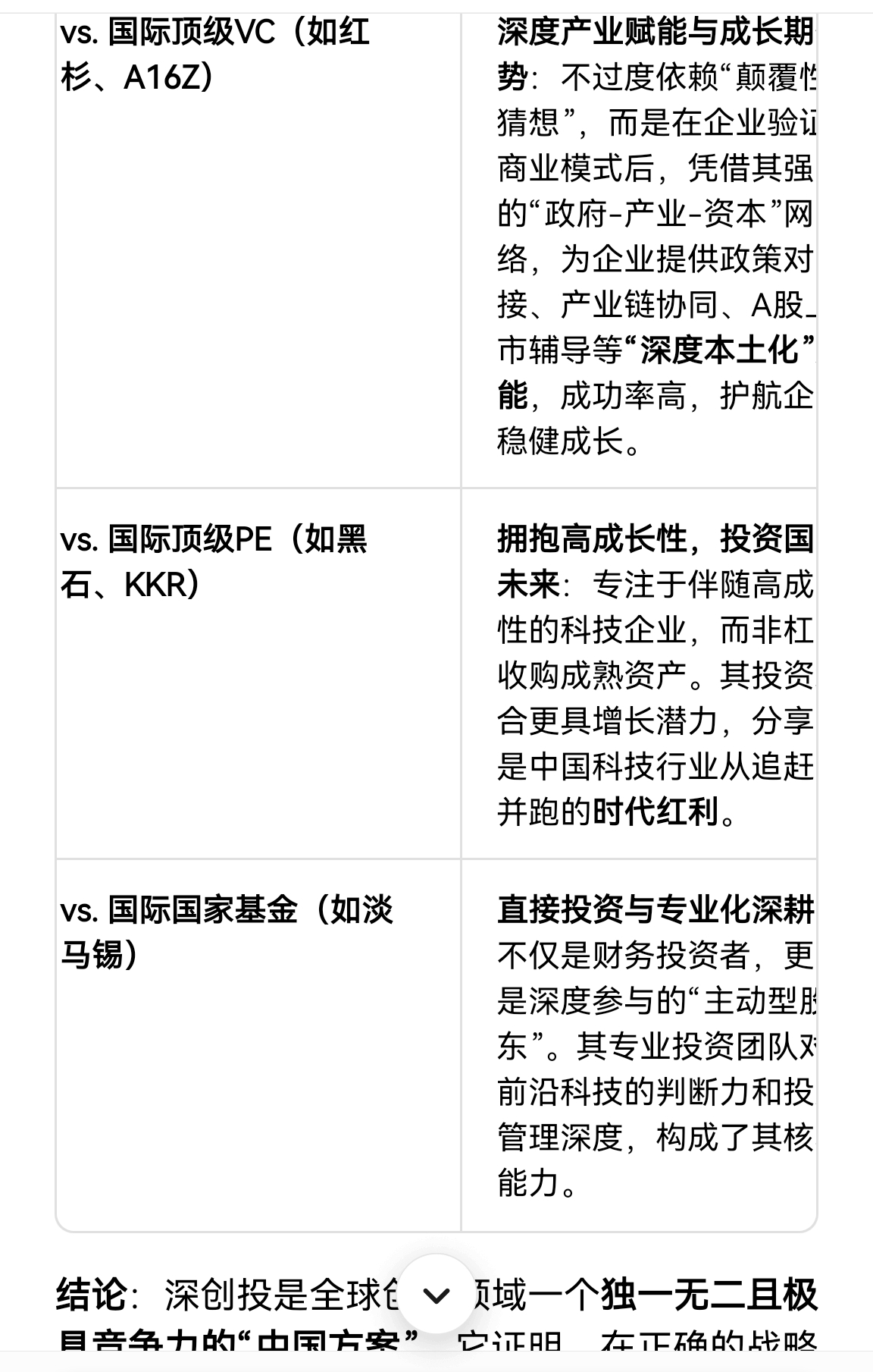 vs. 国际顶级VC(如红杉、A16Z) 深度产业赋能与成长期优势:不过度依赖“颠覆性猜想”,而是在企业验证商业模式后,凭借其强大的“政府-产业-资本”网络,为企业提供政策对接、产业链协同、A股上市辅导等“深度本土化”赋能,成功率高,护航企业稳健成长。 提供了在复杂经济体中,资本助力实体产业规模化发展的成功典范。