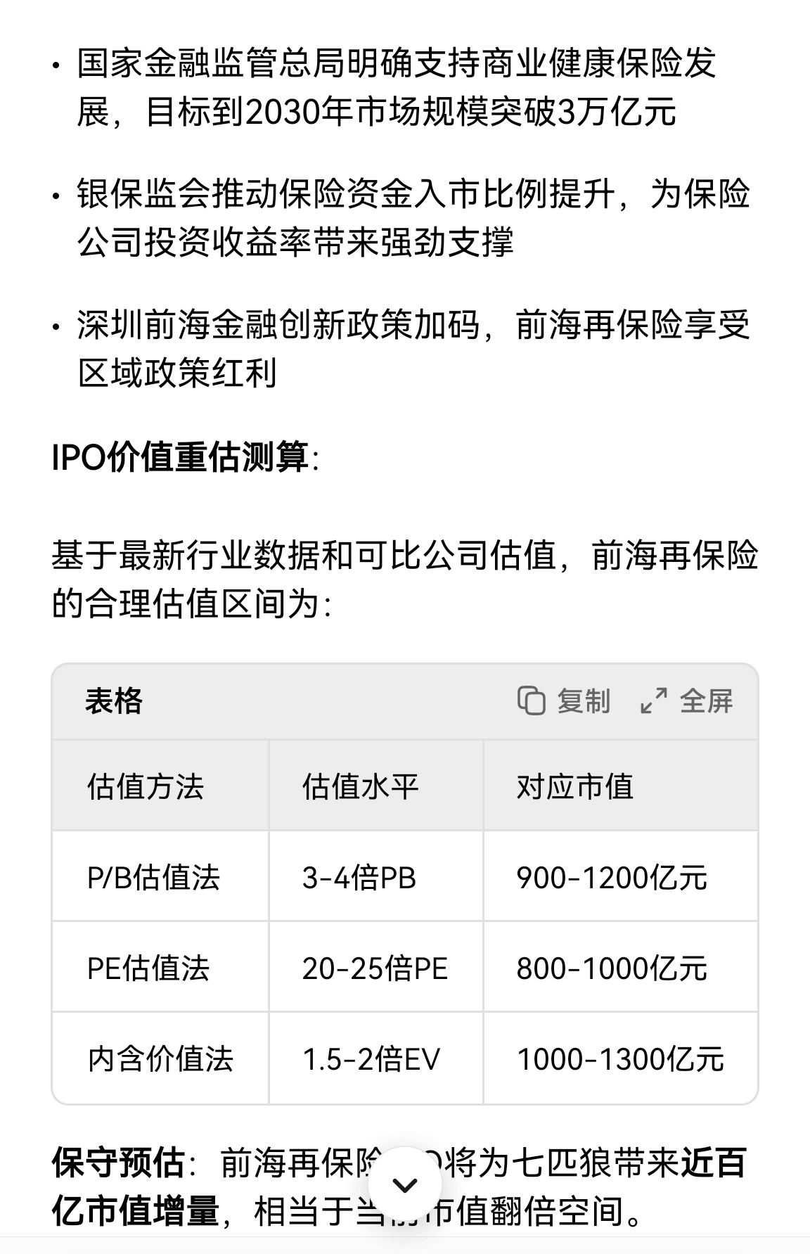 保守预估:前海再保险IPO将为七匹狼带来近百亿市值增量,相当于当前市值翻倍空间。