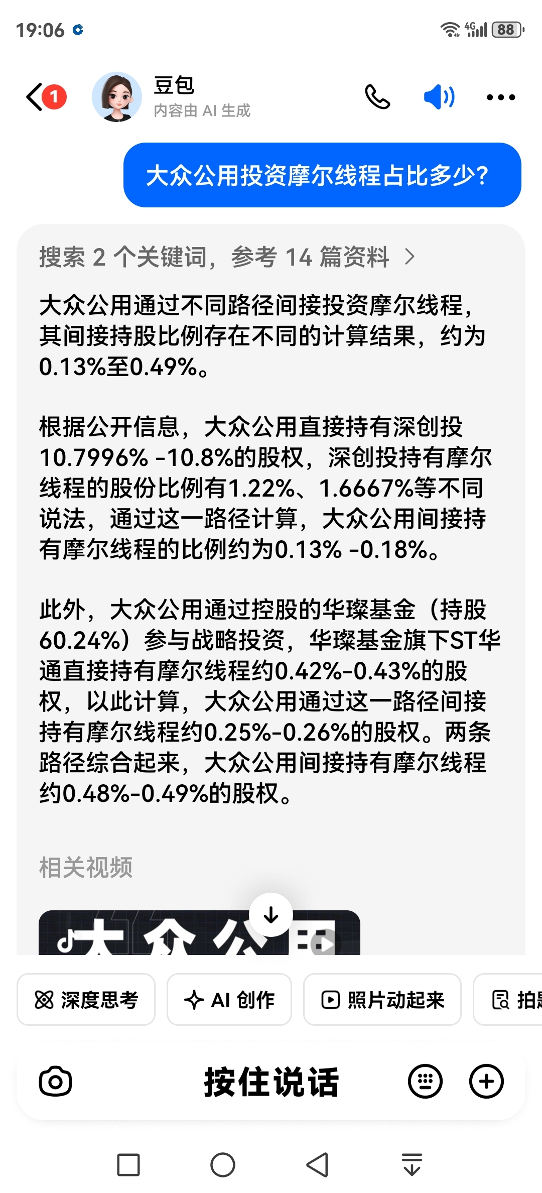 大众持有近0.5%摩尔股份,若上市估值按低价位一千亿,那大众就持有五亿元,发了发