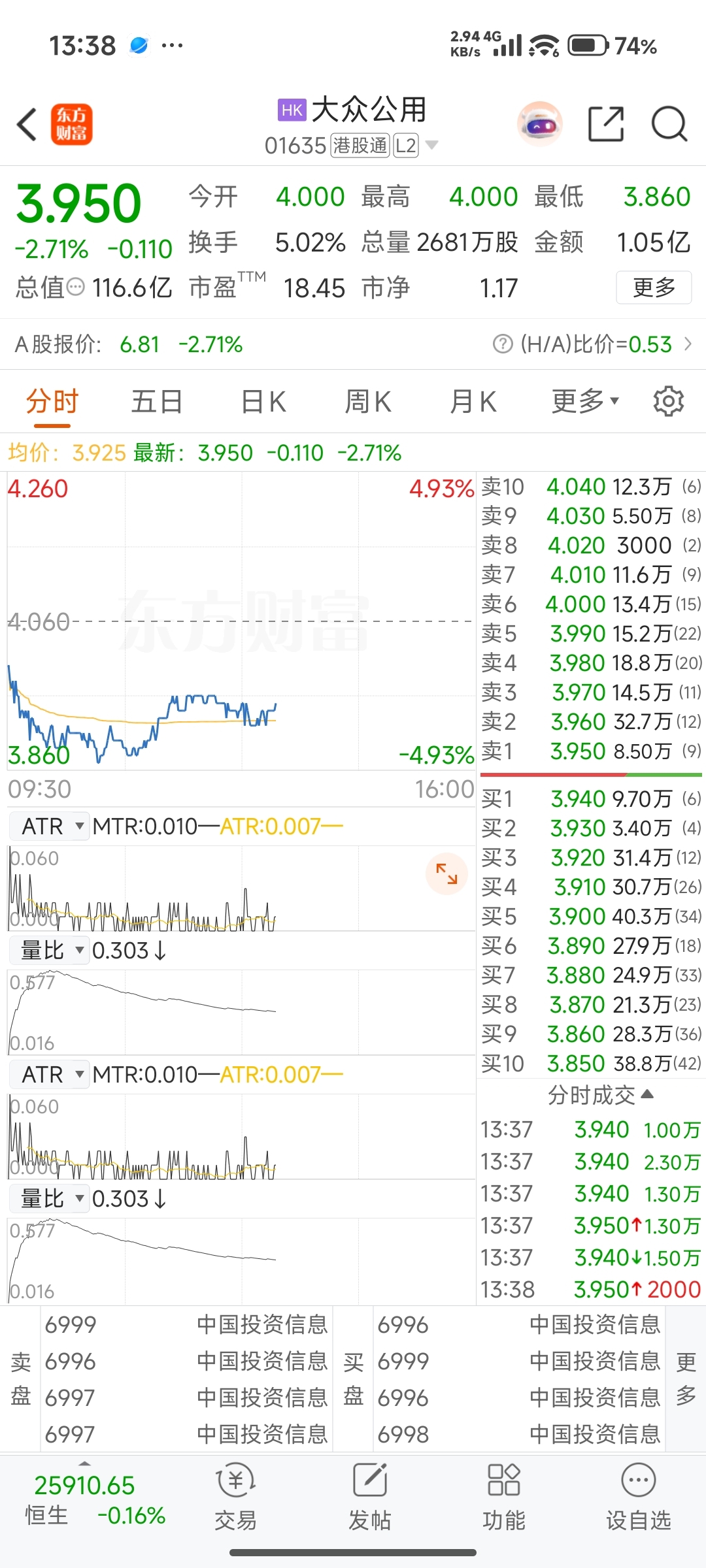 $大众公用(HK|01635)$ A股跌2.71%,H股也是跌2.71%,捏拿得分毫不差