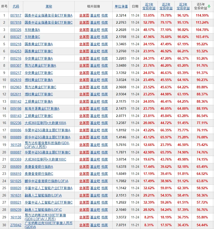 其实也是有的,只是稳定性普遍赶不上纳指,这里整理最近5年定投收益率前30的基金名单: