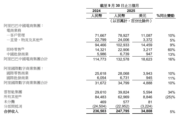 客户管理收入增10%至789亿,88VIP客户和淘宝APP月活均实现两位数增长;国际数字商业收入增长10%至348亿,海外托管服务范围超30个国家,B2B采购推出AI代理版本。