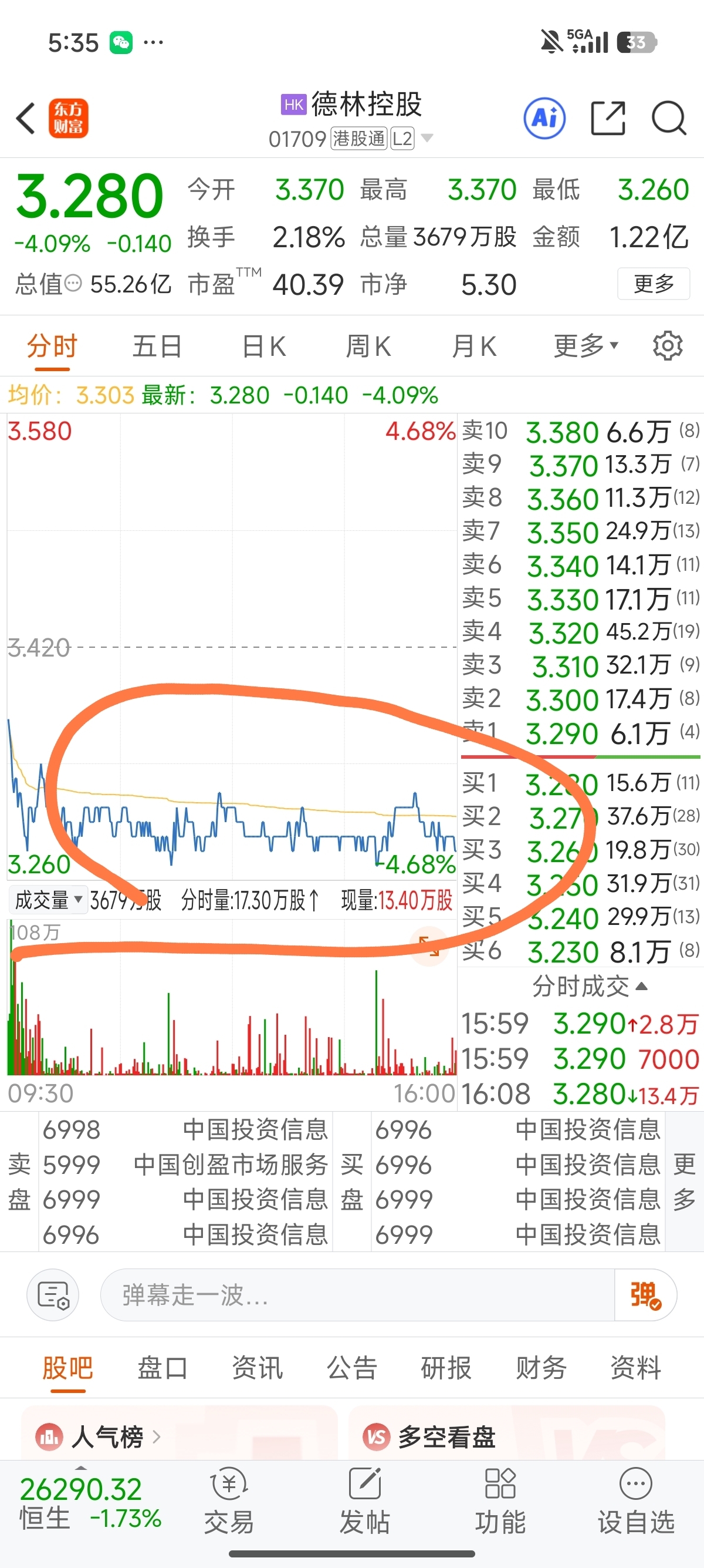 $德林控股(HK|01709)$ 其实,今天虽然跌了,大家心情不好,但是量能萎缩,而且在很小区间震了一天,还算过得去。