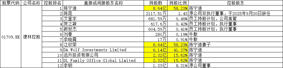 $德林控股(HK|01709)$ 陈宁迪先生通过DA Wolf、迅升及个人持股等方式,合共拥有约7.38亿股公司股份的权益,占已发行股本约43.78%。其中,DA Wolf持有约5.48亿股,迅升持有约1.72亿股,陈先生个人持有约1,814万股,其配偶江女士持有约19.74万股。