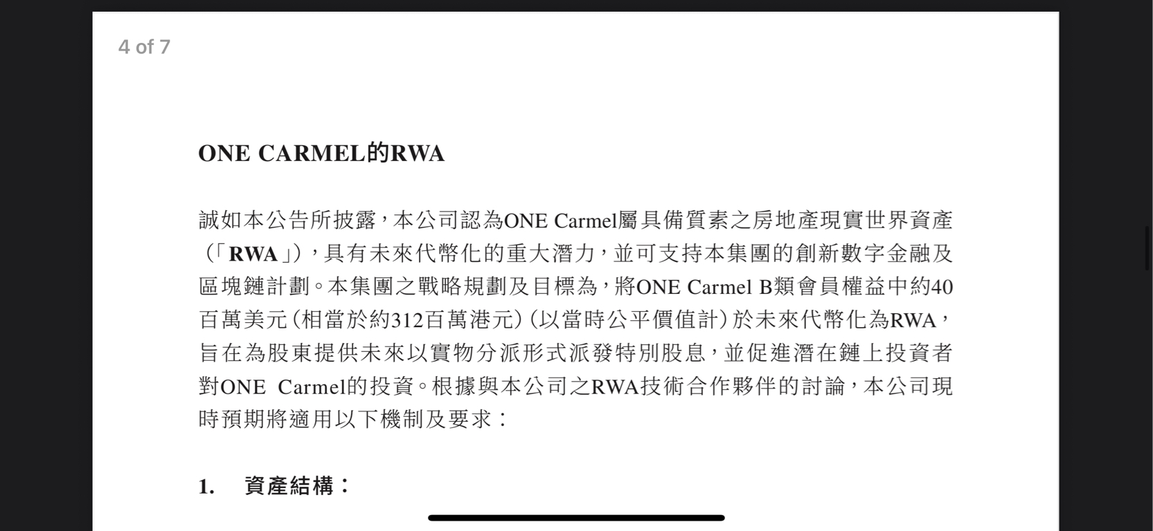 本集团之战略规划及目标为,将ONE Carmel B类会员权益中约40百万美元(相当于约312百万港元)(以当时公平价值计)于未来代币化为RWA,旨在为股东提供未来以实物分派形式派发特别股息,并促进潜在链上投资者对ONE Carmel的投资。