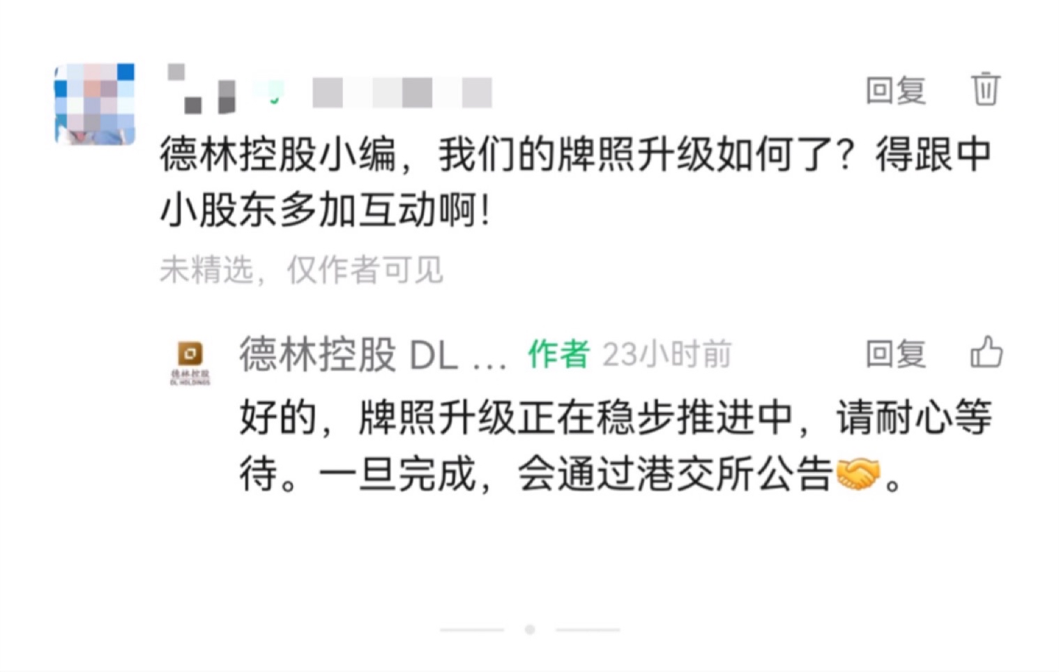$德林控股(HK|01709)$ 本来今晚牌照升级成功,但是SFC没有下发函件,预备好的通函只能再次延期,只能等明天牌照升级成功后,通函才会发布,涉及规划细节,没办法,现在就能等SFC了,小公司受制于人,可以理解。