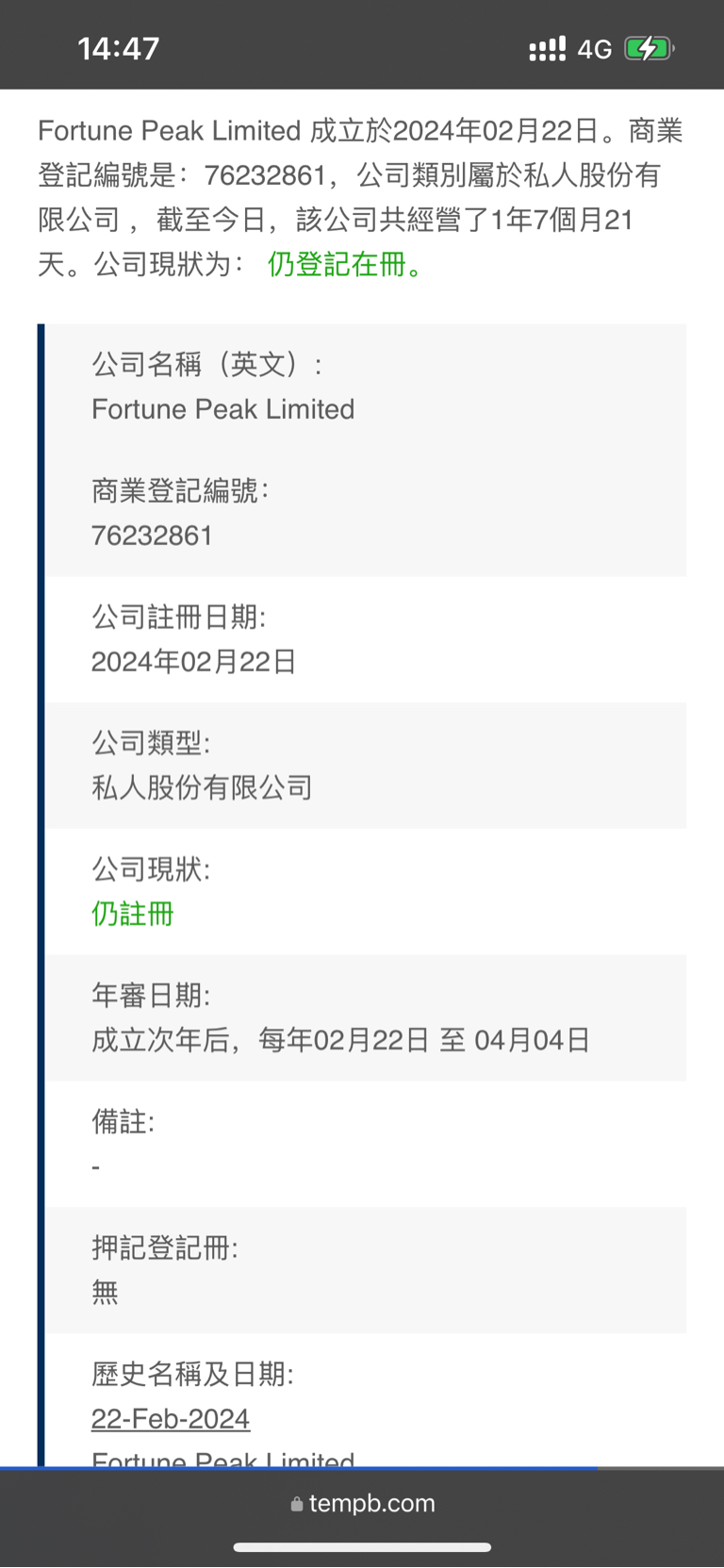 卖矿机的FortunePeakLimited谁能查到,扒一扒这公司啥实力,我查的