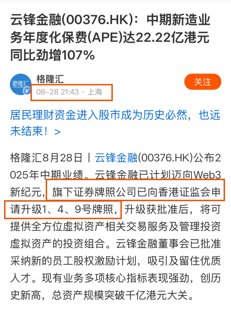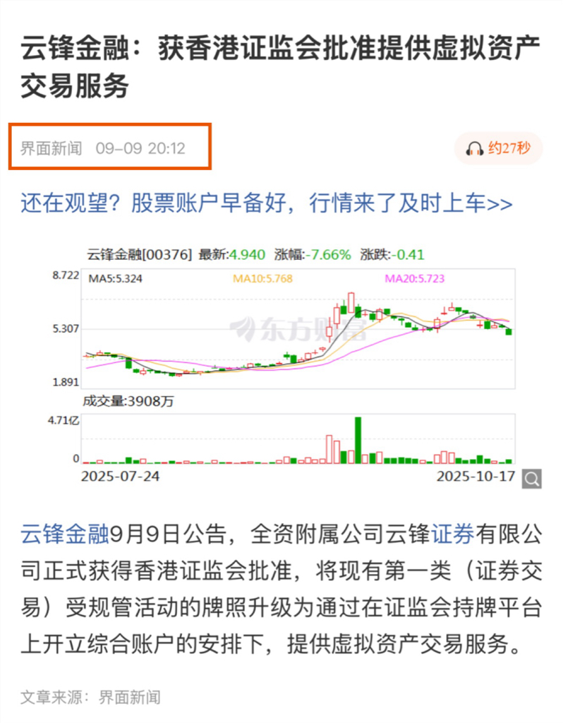 云锋金融8月28日公告正在升级虚拟资产牌照,9月9日公告已成功获批。