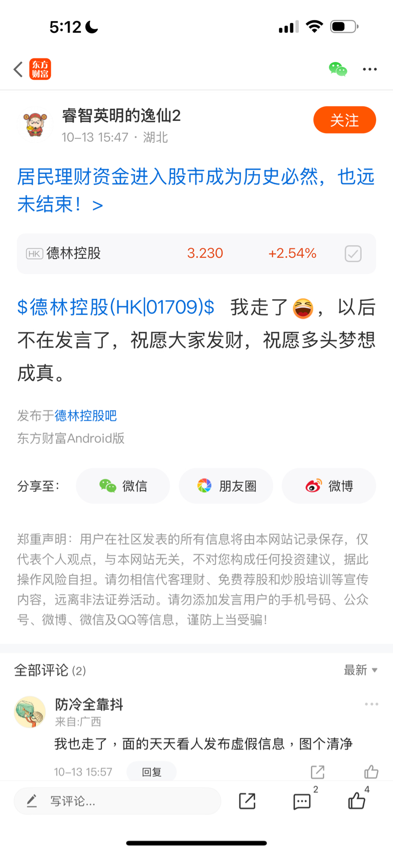 $德林控股(HK|01709)$ 这俩个人都说走了,以后不发言了,怎么又回来骗人了?希望我们持仓的人割肉把货低价再给你们?你们这样的小丑行经只会让人取笑