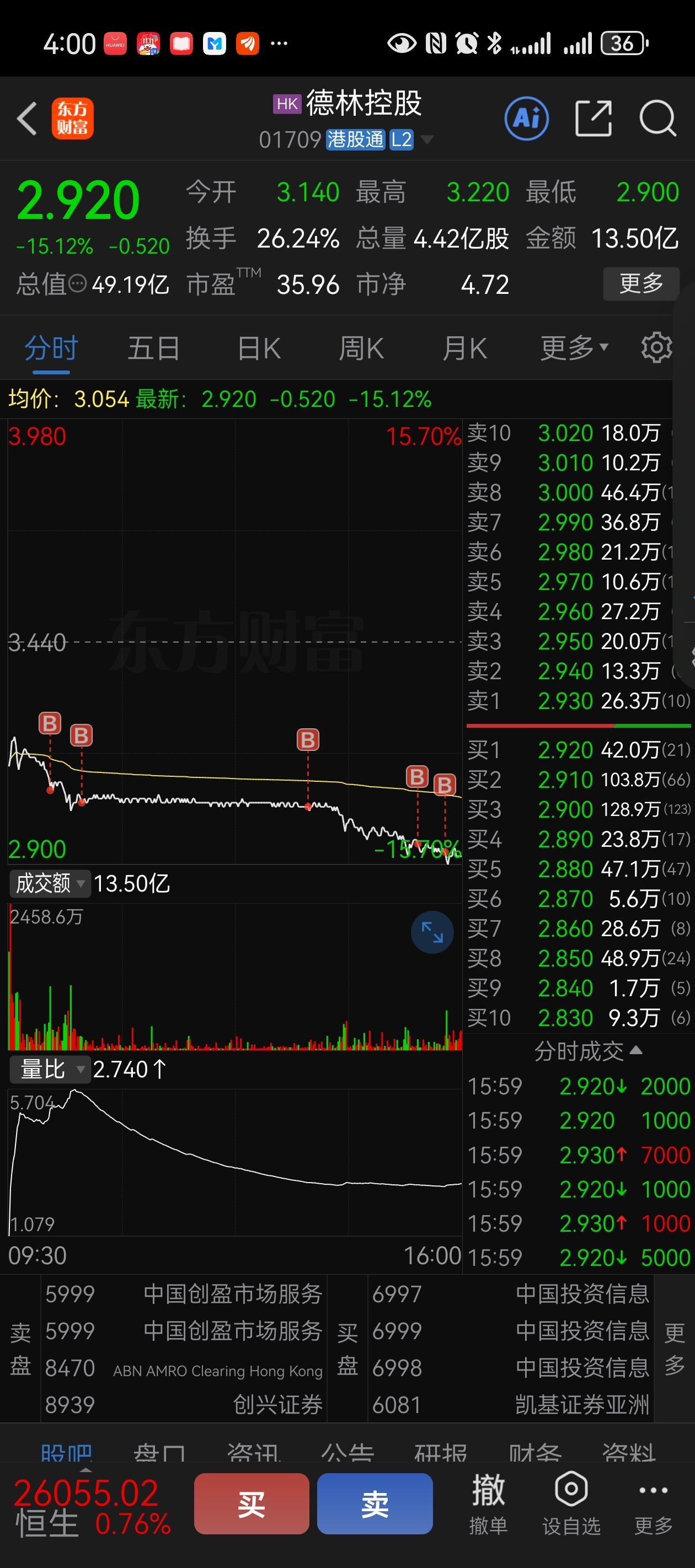 $德林控股(HK|01709)$ 昨天留下的2万股回撤了1万多块,真有点心疼虽然不知道后面还有没有未知的风雨,之前卖出的仓位还是都接回来了