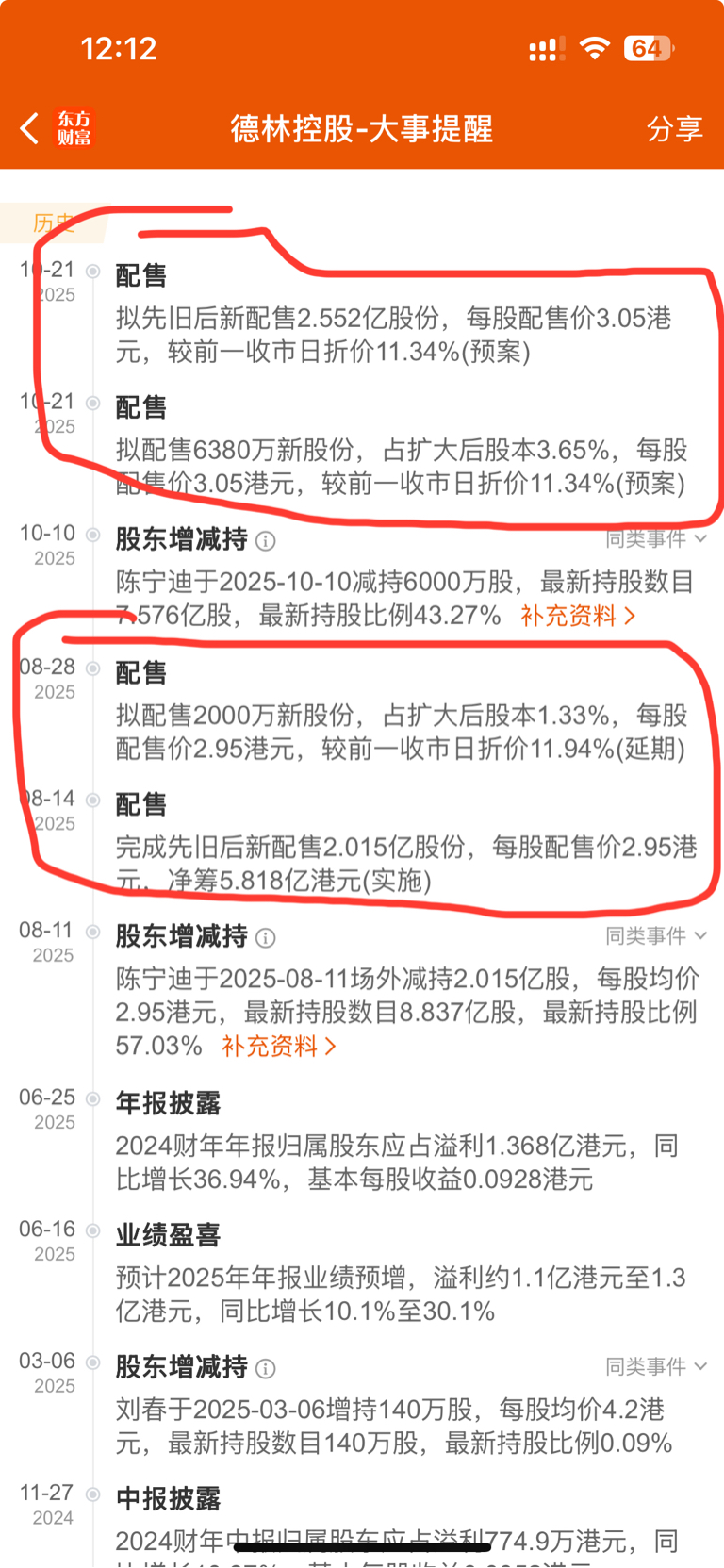$德林控股(HK|01709)$ 这才三个月不到,就配售了4.7亿股,加上减持2亿股,这就6.7亿股被套现拿走了啊,小迪子写公告难怪这么积极。将近20亿的收入,让我每天写利好公告,每天几千万的收入啊,这比开公司赚钱多啊